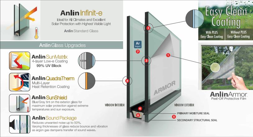 The Anlin Coronado Series offers several glass options, including clear, tinted, and obscure glass. Homeowners should choose a glass option that meets their privacy and aesthetic preferences.